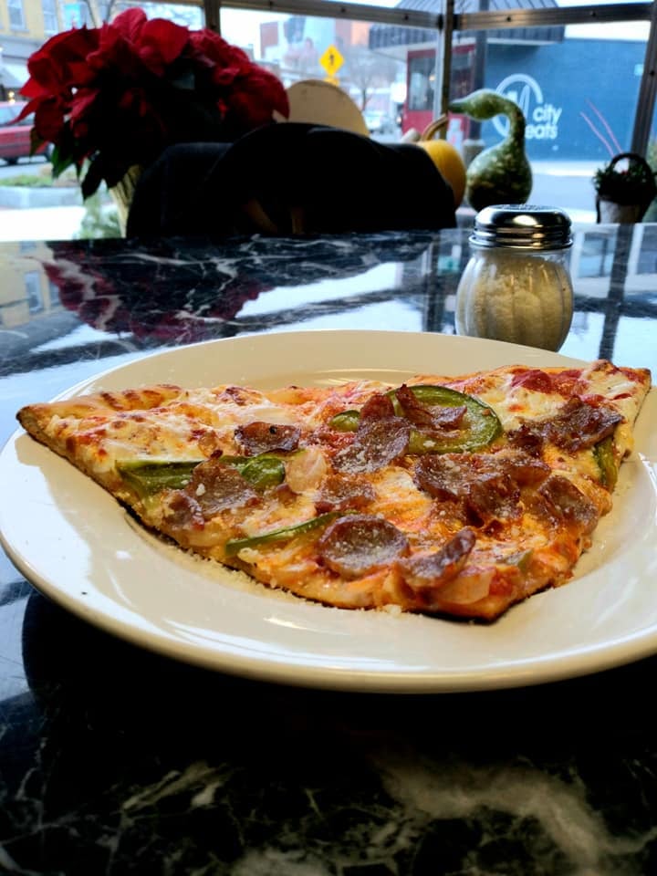 The take-out lunch crowd was popping in and out as our duo took seats at the bar. Slices and sandwiches were coming from the kitchen and heading out the door on a warm, sunny Sunday afternoon.