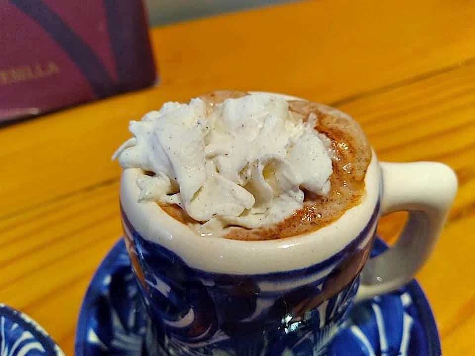 The Elixer with whipped cream is the Zapoteca, an unsweetened sip with pure chocolate and a bit of vanilla. The other, a Mayan Pure Spice elixer also has pure chocolate, coconut, sugar, herbs, nuts, floral, and chili. Be aware that this one brings a little spicy heat to the equation.